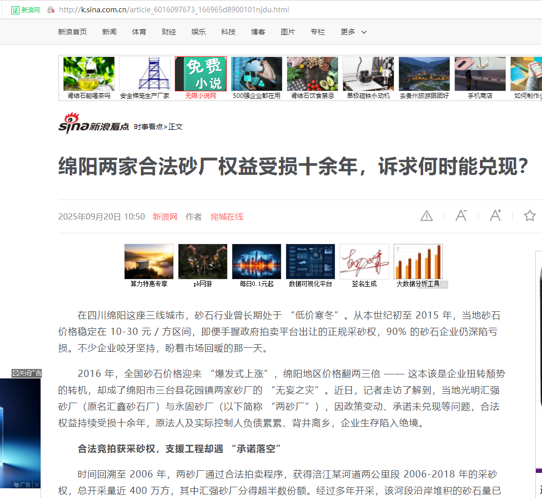 绵阳两砂厂的遭遇,是三线城市民营企业在政策变动与市场波动中艰难求生的一个缩影。从 “低价寒冬” 中咬牙坚持,到价格上涨时盼来希望,再到因政策执行偏差陷入 “无妄之灾”,十余年时间里,两家合法经营的企业从 “有厂有料” 沦为 “无址无业”,原经营者负债背井离乡,这样的结局令人唏嘘,更值得深思。